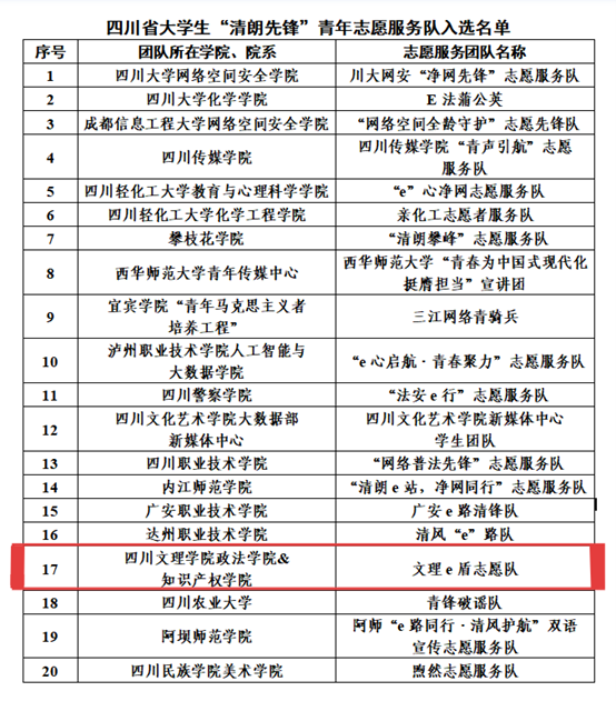 为深入学习贯彻习近平法治思想和习近平总书记关于网络强国的重要思想,深入宣传解读互联网法律法规,大力普及网络举报辟谣知识,提升青年学生对网络有害信息的辨识能力,中共四川省委网信办、共青团四川省委联合组织开展2025年在川高校大学生“e路同行 清风护航”青春志愿专项行动,面向在川高校大学生选拔招募20支四川省大学生“清朗先锋”青年志愿服务队。beat365“文理e盾志愿队”脱颖而出,成功入选。