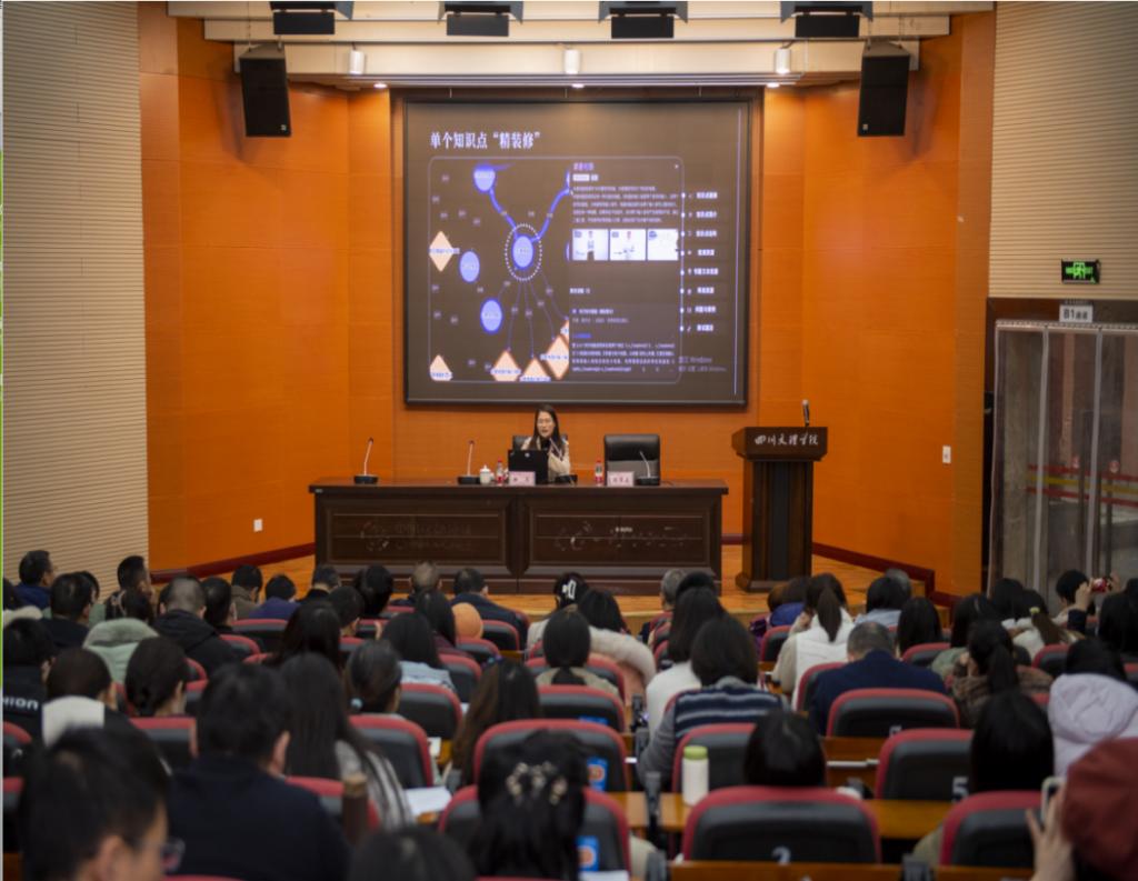 为更新教师教育教学理念,提高数字化教学能力,了解新形态教育教学方式,聚焦信息化手段赋能教学,推动课程知识图谱和优质资源建设,助力学校教学改革模式创新,12月15日,beat365“巴山教育教学论坛”第五讲开讲。智慧树四川课程总监徐乐应邀作“知识图谱建设与教学能力提升”专题讲座。讲座由副校长程碧英主持,全校200余位教师参加。