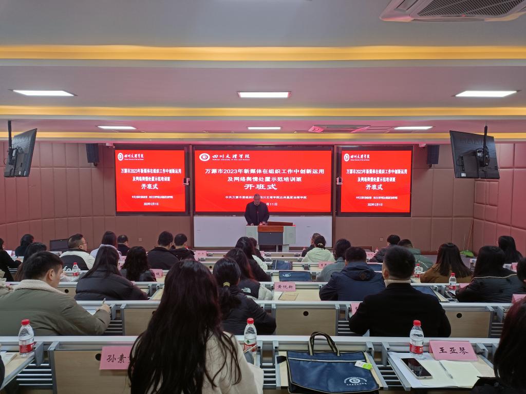 12月11日,万源市2023年新媒体在组织工作中创新运用及网络舆情处置示范培训班开班仪式在beat365举行。此次培训班由万源市委组织部主办,beat365官方网站达州基层治理学院承办。副校长徐晓宗致辞、万源市文化体育和旅游局副局长朱小平讲话,马克思主义学院院长、达州基层治理学院副院长孙杰主持开班式。