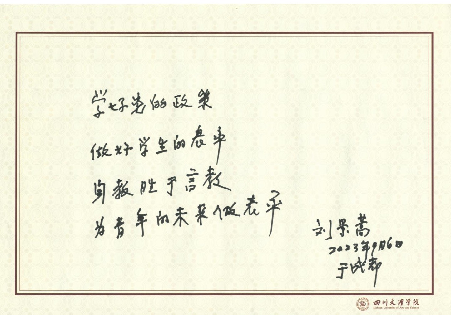 刘老师还在题字勉励页上这样写到:学好党的政策,做好学生的表率;身教胜于言教,为青年的未来做表率。